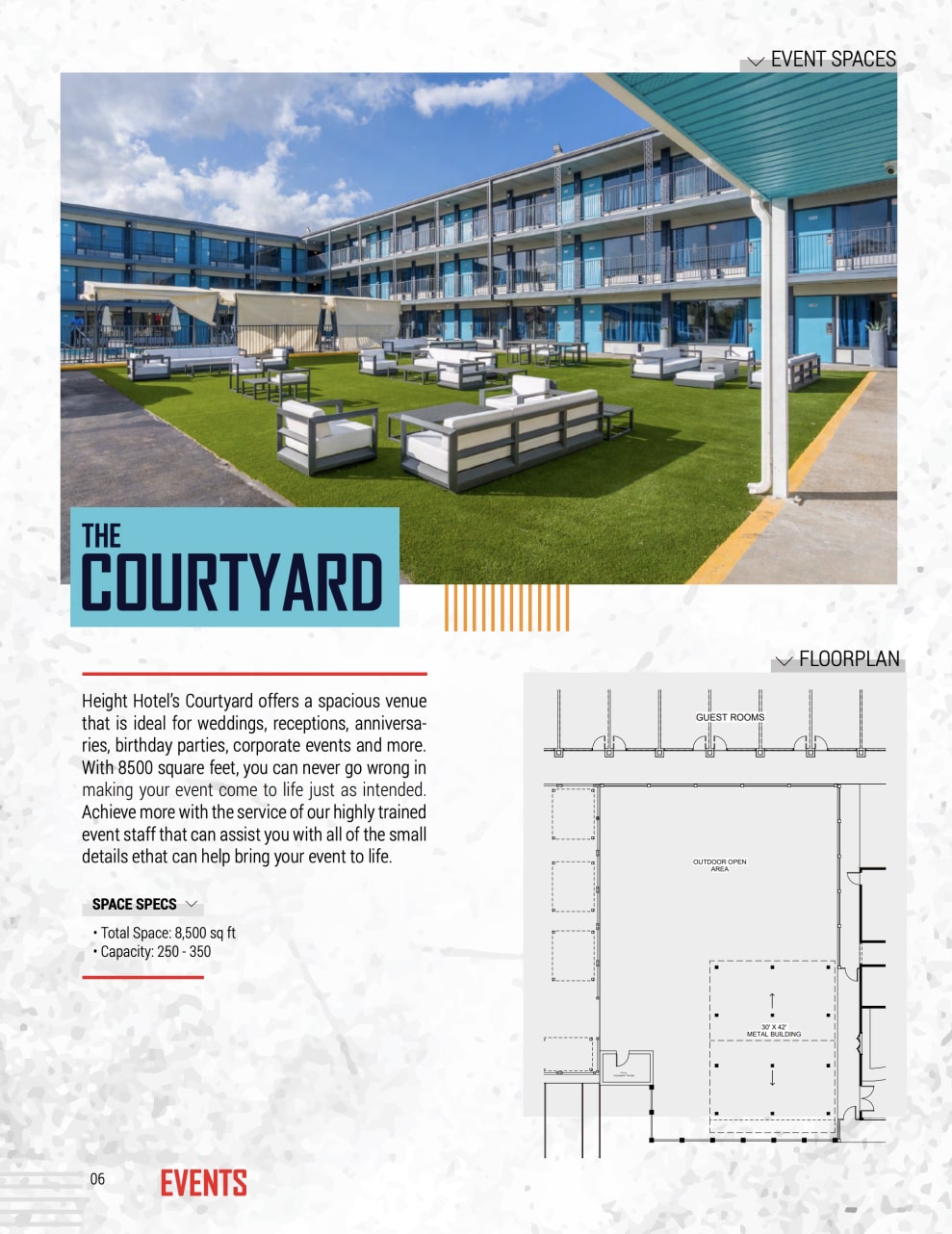 Height Hotel’s Courtyard offers a spacious venue that is ideal for weddings, receptions, anniversaries, birthday parties, corporate events and more. With 8500 square feet, you can never go wrong in making your event come to life just as intended. Achieve more with the service of our highly trained event staff that can assist you with all of the small details ethat can help bring your event to life.